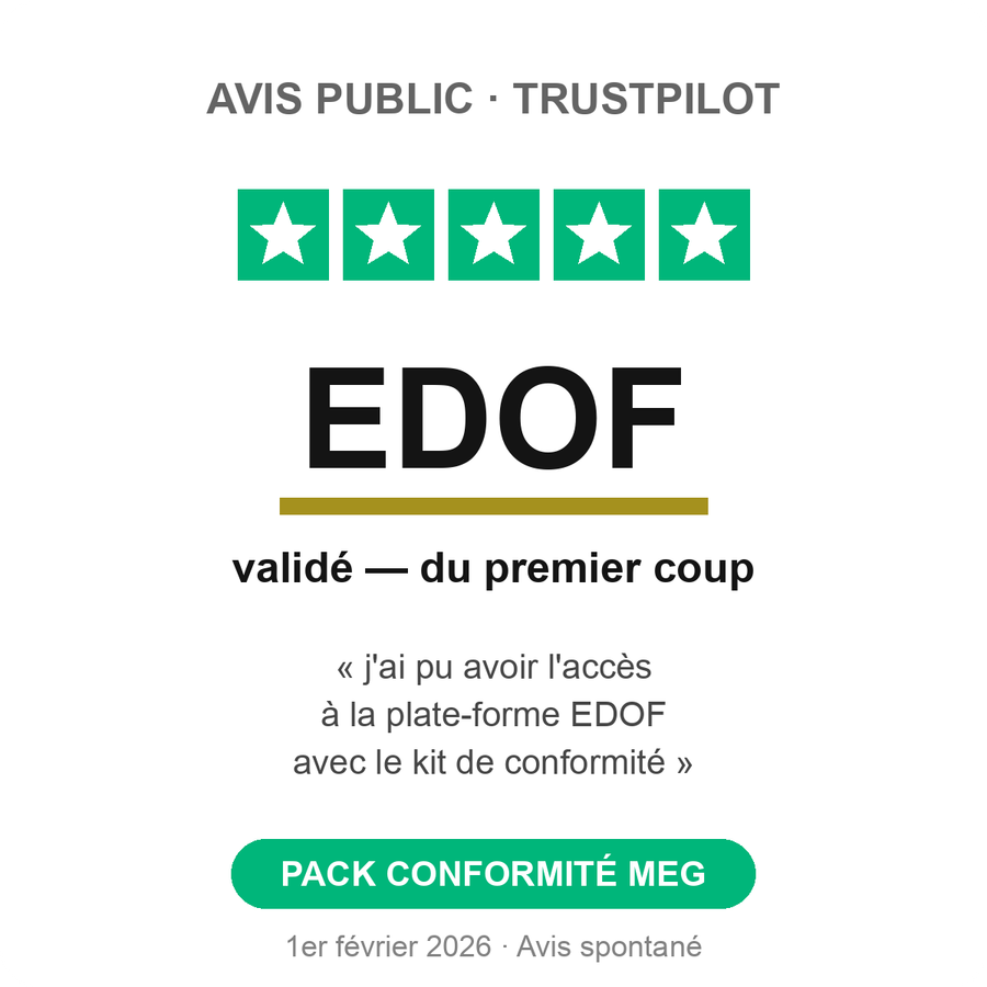 « Grâce à l'équipe MEG et leurs outils tout est facile de gestion ! Pour ma société, j'ai pu avoir l'accès à la plate-forme EDOF avec le kit de conformité… un plus essentiel ! Merci aux équipes »